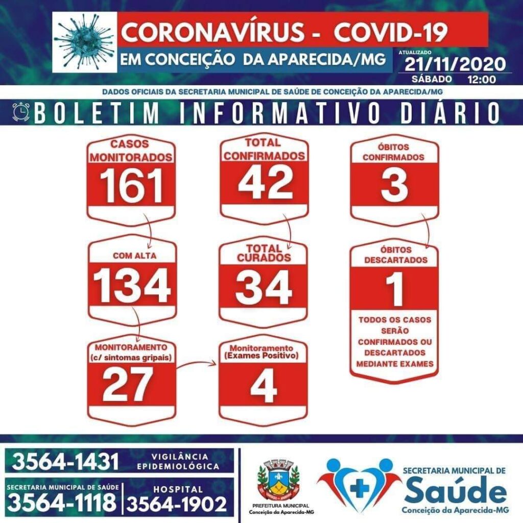 Conceição da Aparecida registrou 6 novos casos de COVID-19 no Município. Os dados são da Secretaria Municipal de Saúde que divulgou hoje a tarde o boletim epidemiológico. Agora, são 42 casos confirmados da doença, sendo que 34 já estão recuperados e 4 pessoas seguem sendo monitoradas. A cidade tem ainda tem 27 casos suspeitos também […]