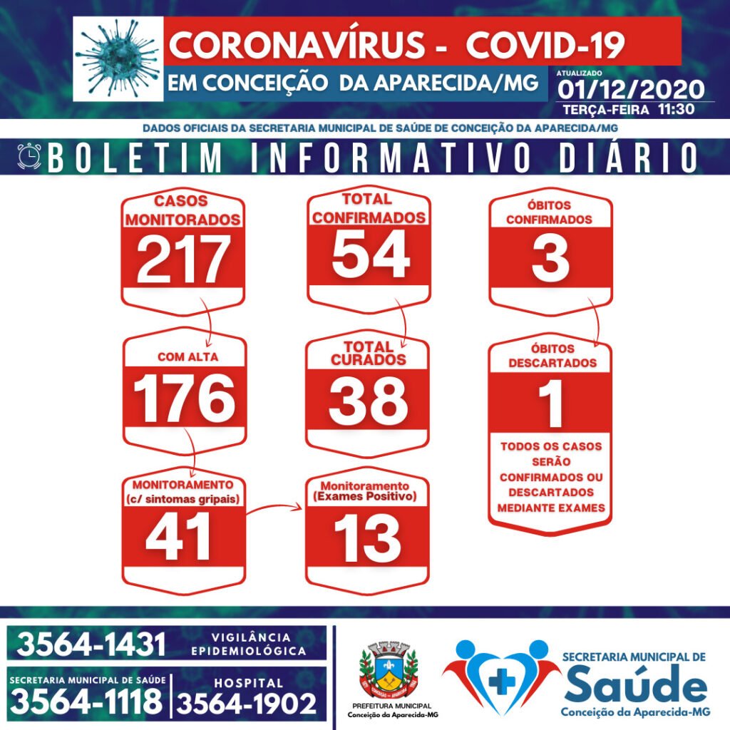 A Prefeitura de Conceição da Aparecida confirmou nesta terça-feira (01), mais 6 casos positivos da COVID-19 no Município. Agora a cidade chega a 54 casos confirmados desde o início da pandemia. Dentre o número total de casos, 38 já são considerados recuperados. Ao todo 3 pessoas morreram em virtude da COVID-19. A Secretaria Municipal de […]