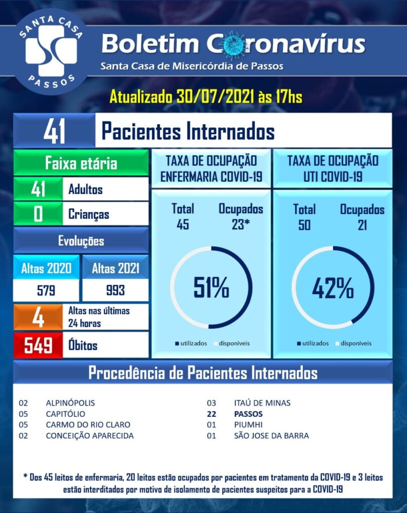 Subiu de 36% ontem para 51% hoje, a taxa de ocupação dos leitos de enfermaria exclusivos para pacientes com a COVID-19 na Santa Casa de Misericórdia de Passos. Já na UTI a ocupação caiu de 46% para 42% nas últimas 24 horas. Não houve nenhum óbito de pacientes internados e 4 altas médicas foram registradas. […]