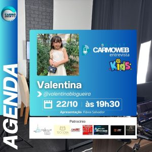 O Podcast Carmo Web Kids está um sucesso e o terceiro episódio vai ao ar nesta quarta-feira, 22 de outubro, com uma entrevista especial que promete encantar o público. A convidada da vez é a Valentina Blogueira, que vem conquistando a internet com sua simpatia e os vídeos de parcerias comerciais, ganhando cada vez mais admiradores nas redes sociais.