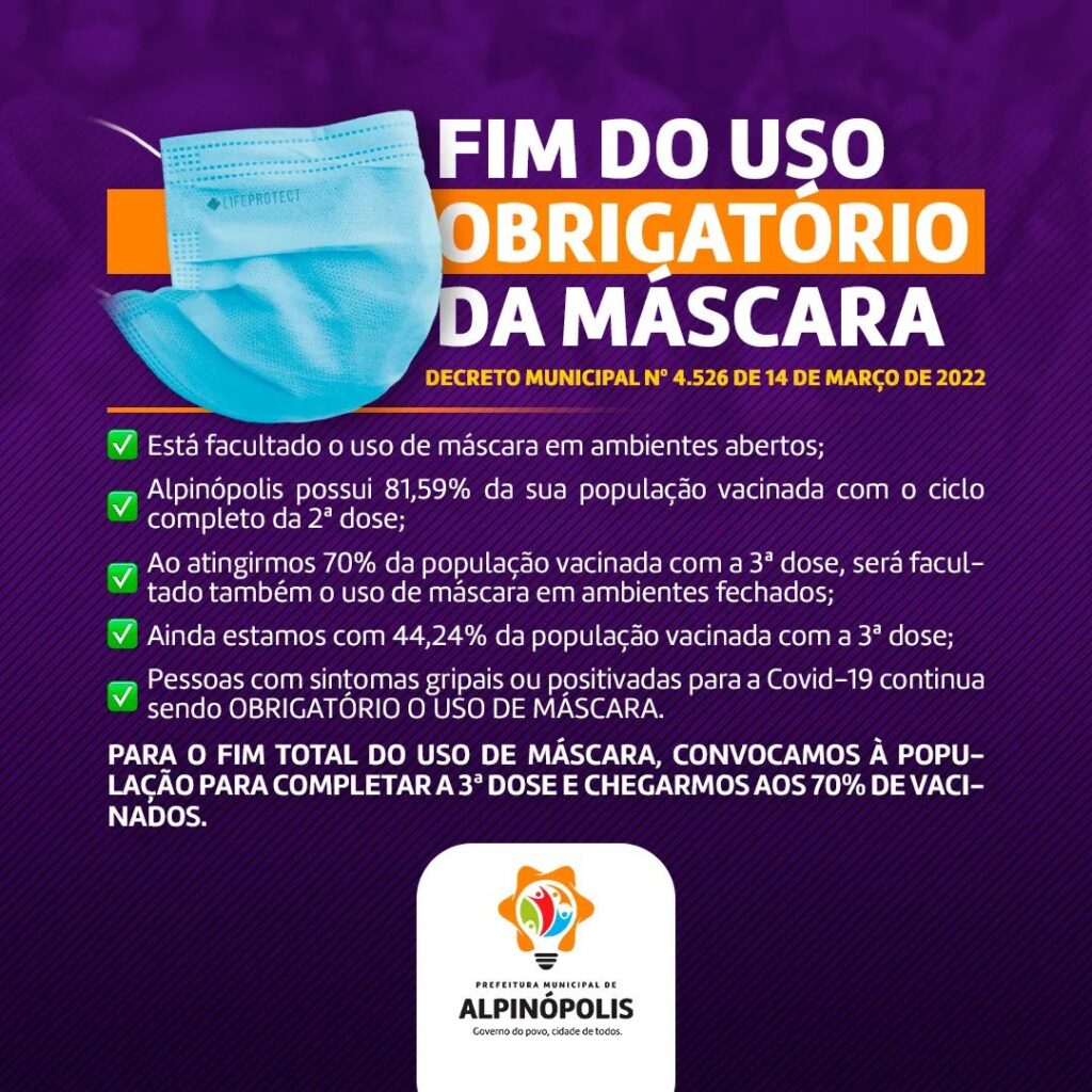 Através de um decreto publicado nesta terça-feira (15), a prefeitura de Alpinópolis decidiu seguir o governo do Estado de Minas Gerais e desobrigar o uso de máscara facial de proteção contra a Covid-19, em locais abertos.