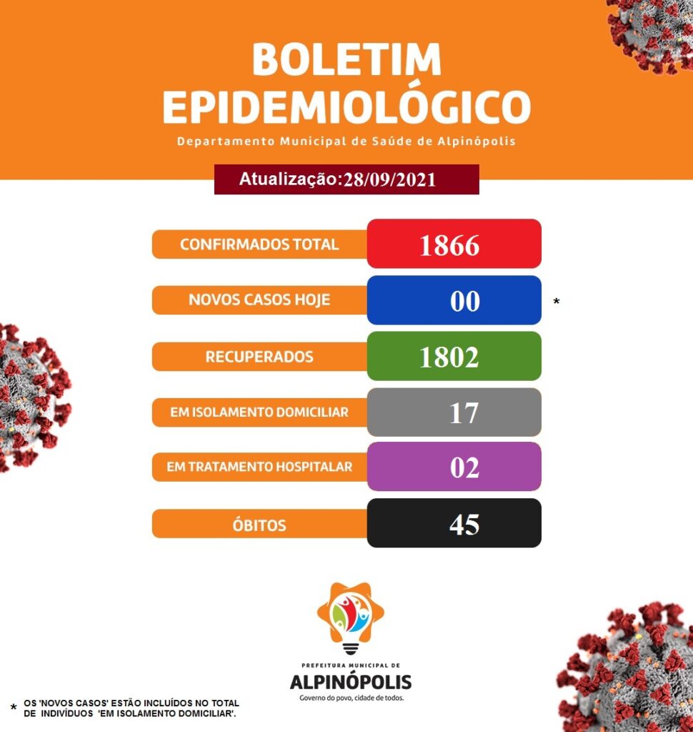 De acordo com o boletim divulgado pelo departamento de saúde, Alpinópolis não registrou nesta terça-feira (28), nenhum novo caso confirmado da doença. A cidade tem 1.866 casos confirmados e 1802 recuperados desde o início da pandemia. O número de pessoas em recuperação domiciliar é de 17 e há 02 pacientes internados.