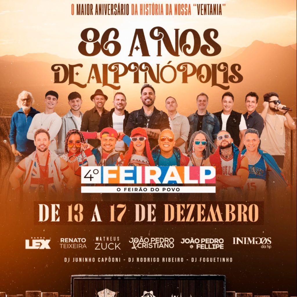 De 13 a 17 de dezembro, Alpinópolis irá celebrar os 86 anos de emancipação político administrativa. O evento que está sendo organizado para comemorar a data é o FeirAlp, que está na sua 4ª edição. A feira reúne comerciantes da cidade que, de forma gratuita, podem expor e vender seus produtos na praça durante as festividades. Todas as despesas com a estrutura da feira são custeadas pela prefeitura.