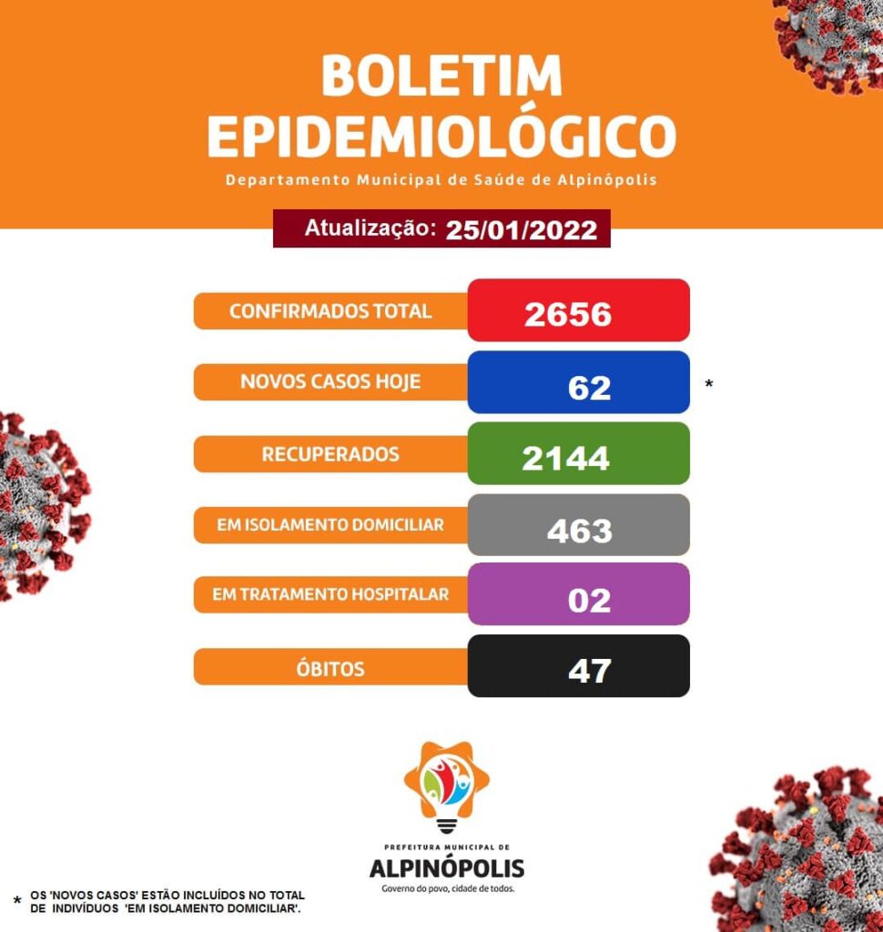 Até o momento, Alpinópolis já registrou 2656 casos confirmados, 2144 recuperados e 47 óbitos causados pelo Coronavírus desde o início da pandemia em 2020.