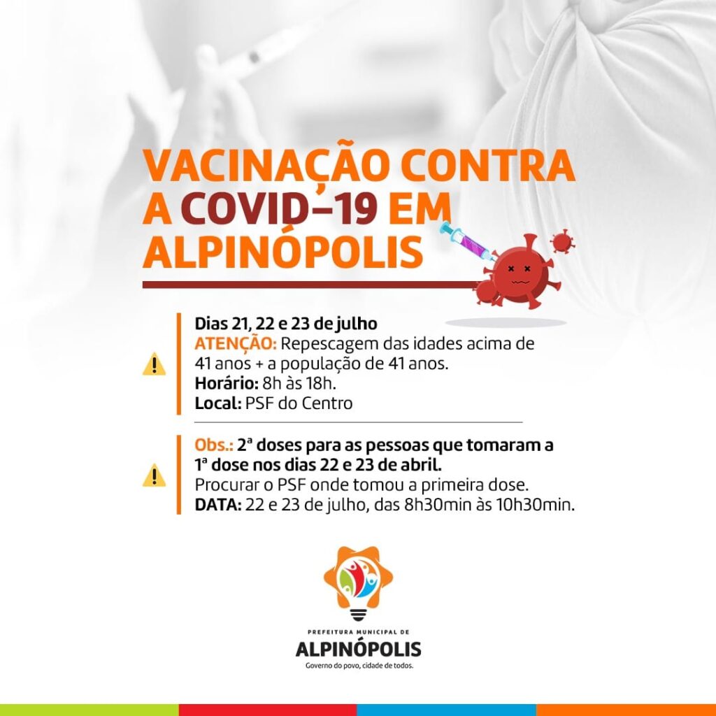 Alpinópolis iniciará a vacinação das pessoas com 41 anos de idade contra a COVID-19, nesta quarta-feira (21). Também serão vacinados as pessoas com idade acima de 41 e que ainda não tomaram a primeira dose.