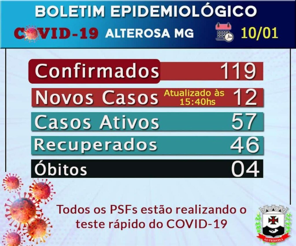 A Prefeitura de Alterosa divulgou agora há pouco o boletim atualizado com o número de casos da COVID-19 no Município.