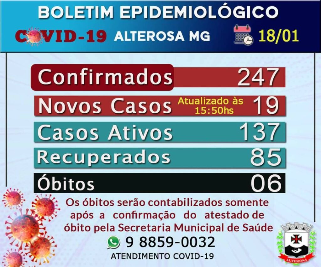 Alterosa começou a semana com 19 novos casos de COVID no município. O número foi divulgado pela Prefeitura através do boletim epidemiológico desta segunda-feira.