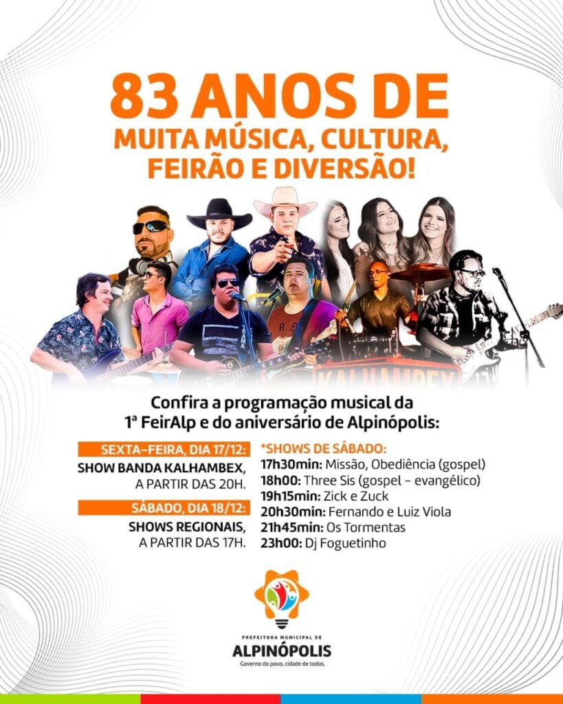 O município completa 83 anos nesta sexta-feira (17), e a programação oficial do evento terá início às 9:00 com abertura da 1ª FeirAlp, na praça Osvaldo Américo Cruz (Praça da Matriz). A feira organizada pela prefeitura em parceria com a ACIALP (Associação Comercial e Industrial de Alpinópolis), vai reunir exclusivamente comerciantes da cidade nos dias 17 e 18.