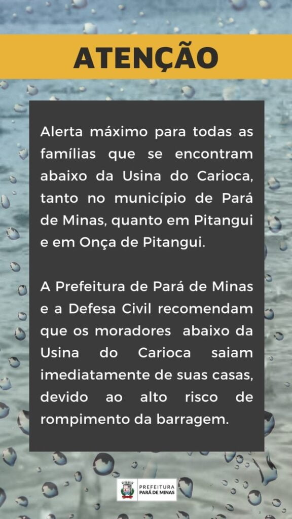 A Prefeitura de Pará de Minas e a Defesa Civil recomendaram, neste domingo (9), que os moradores da cidade, Pitangui e Onça de Pitangui, que moram abaixo da Usina do Carioca, deixem as casas imediatamente, pois há alto risco de rompimento da barragem.