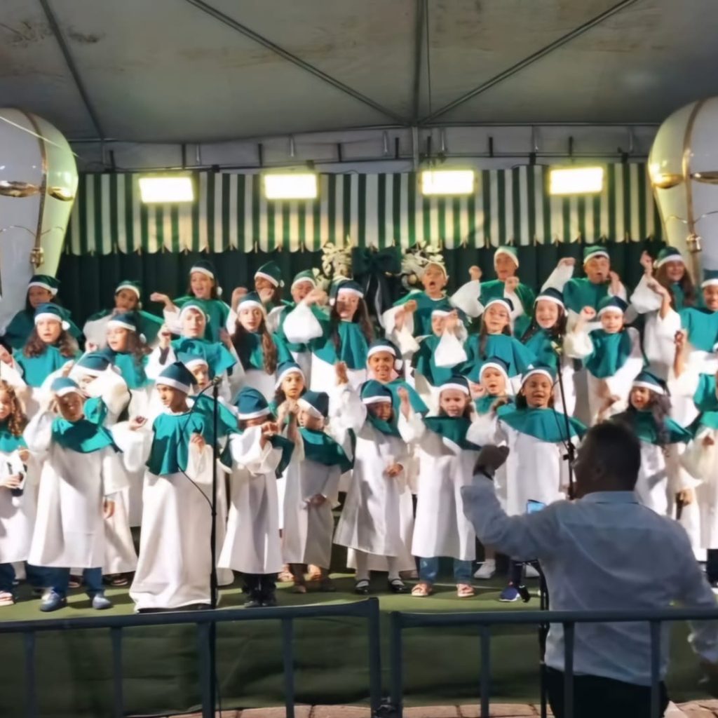 Mais de 60 crianças fizeram parte do coral que encantou com um repertório repleto de músicas natalinas. O Coral com as crianças e a Cantata de Natal fazem parte do projeto de musicalização infantil realizado nas escolas Anchieta, Coronel, Maria Goulart e Santo Antônio, coordenado pelo Professor e Maestro Bruno Valeriano, o Bruninho como é mais conhecido.