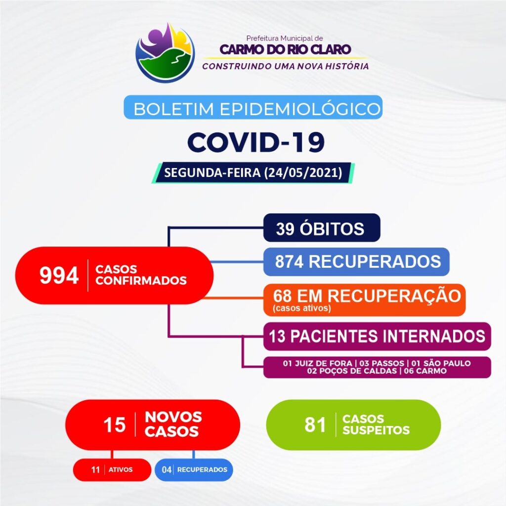 Carmo do Rio Claro confirmou nesta segunda-feira (24), um total de 15 novos casos da COVID-19. A cidade tem agora um total de 994 casos confirmados com 874 recuperados desde o início da pandemia.