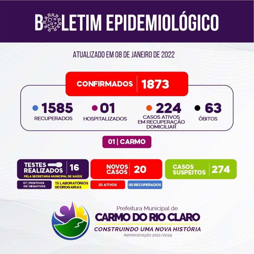 Ainda de acordo com o boletim, Carmo do Rio Claro tem 1873 casos confirmados, 1585 recuperados e registrou 63 óbitos desde o início da pandemia.
