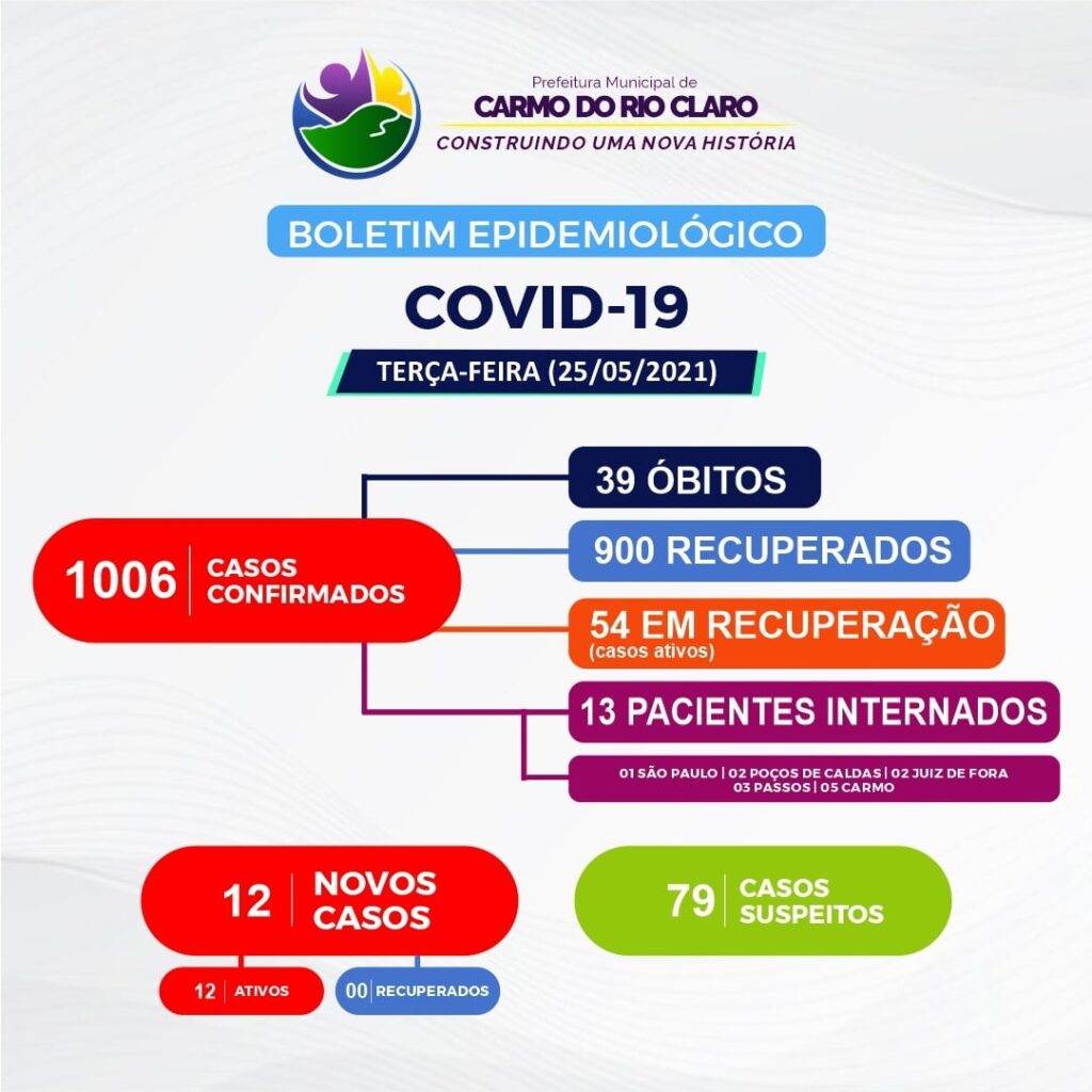 Carmo do Rio Claro confirmou nesta terça-feira (25), um total de 12 novos casos da COVID-19. A cidade tem agora um total de 1.006 casos confirmados com 900 recuperados desde o início da pandemia.