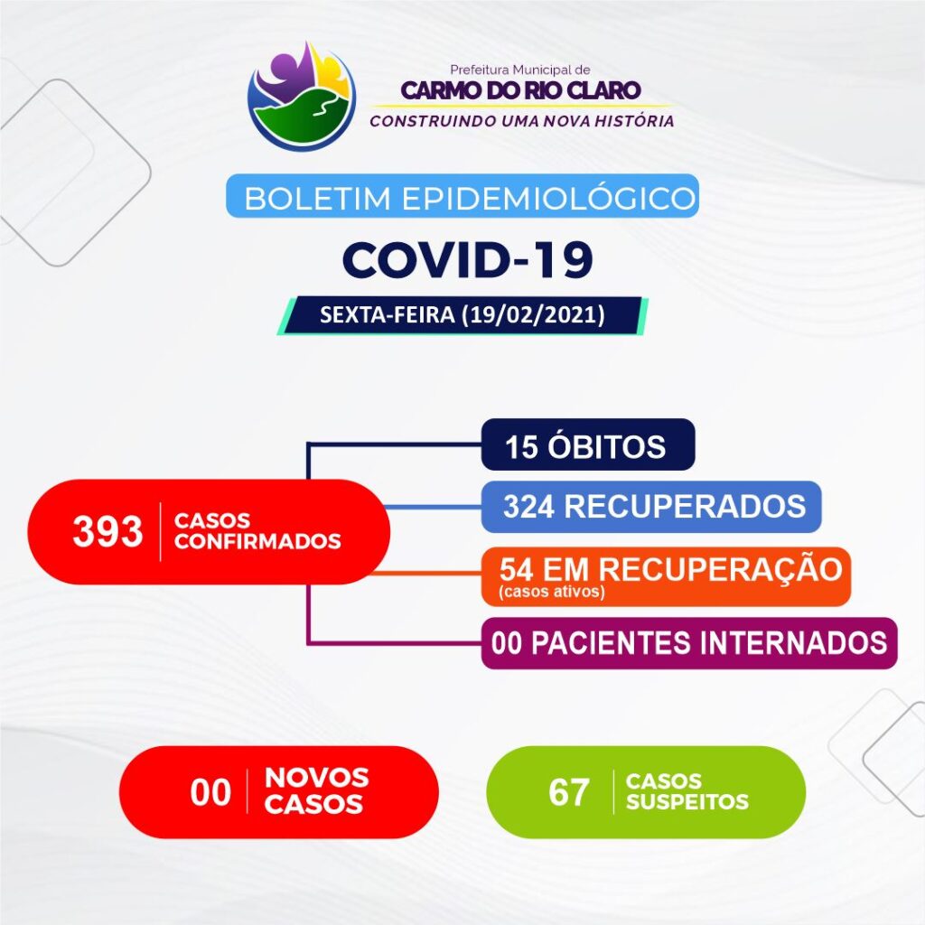 De acordo com o boletim epidemiológico divulgado pela Secretaria Municipal de Saúde, Carmo do Rio Claro continua sem registrar novos casos confirmados da COVID-19 pelo segundo dia consecutivo.
