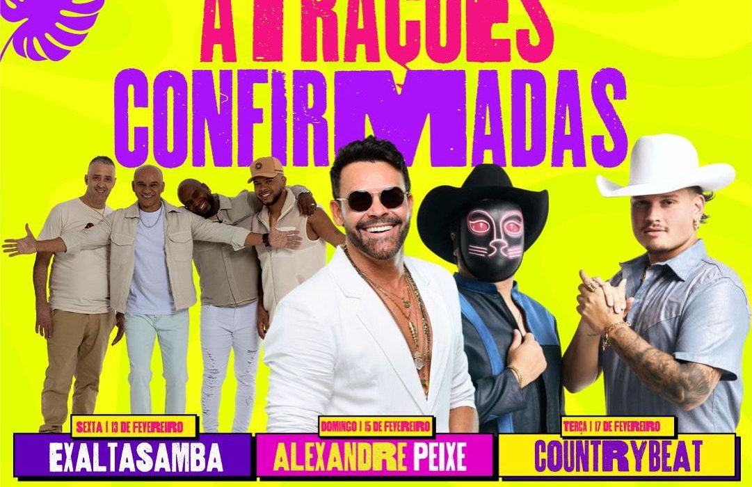 Entre as atrações já confirmadas estão nomes de peso do cenário musical brasileiro. O grupo Exaltasamba será a atração da sexta-feira, 13 de fevereiro, prometendo abrir a folia com muito samba e nostalgia. No domingo, 15 de fevereiro, quem sobe ao palco é o cantor Alexandre Peixe, conhecido por seus sucessos no axé e hits que marcaram o Carnaval baiano. Encerrando a programação divulgada até o momento, a banda Country Beat se apresenta na terça-feira, 17 de fevereiro, trazendo o melhor do sertanejo e do country.