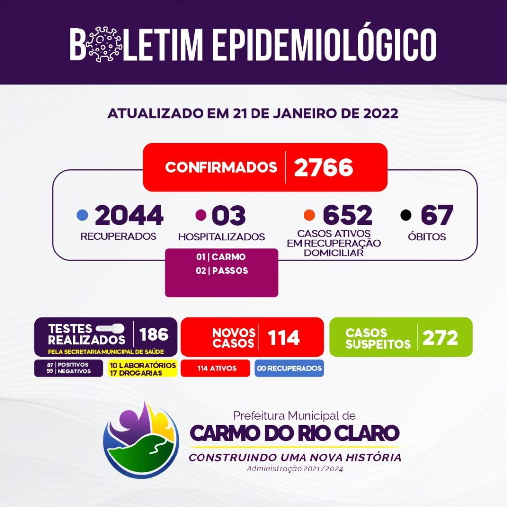 Desde o início da pandemia, Carmo do Rio Claro já registrou 2766 casos confirmados, 2044 recuperados e 67 óbitos causados pelo Coronavírus.