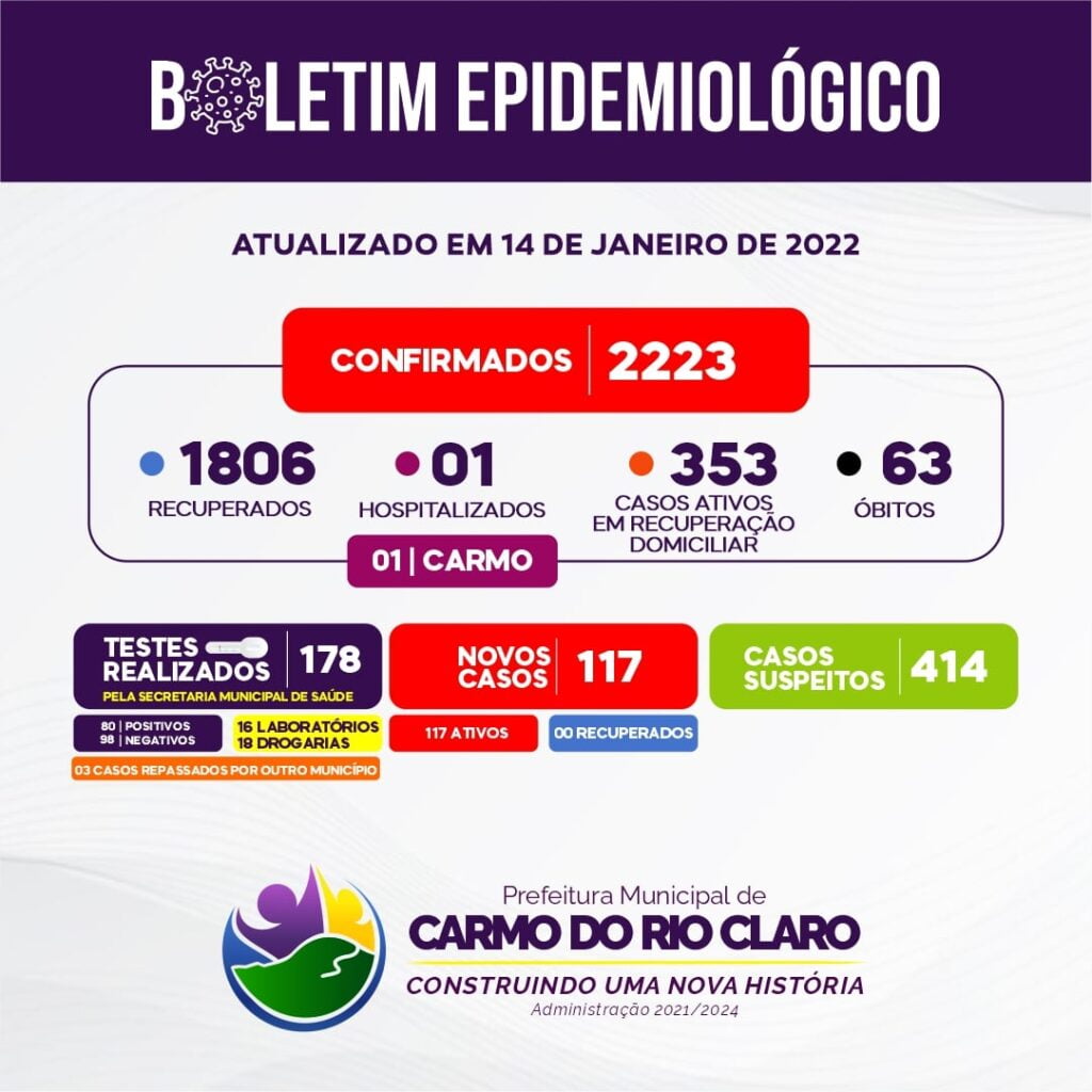 Carmo do Rio Claro registrou nesta sexta-feira (14), 117 novos casos positivos da COVID-19. De acordo com o boletim epidemiológico divulgado pela Secretaria Municipal de Saúde, 353 pessoas estão recuperação domiciliar e há 1 paciente internado.
