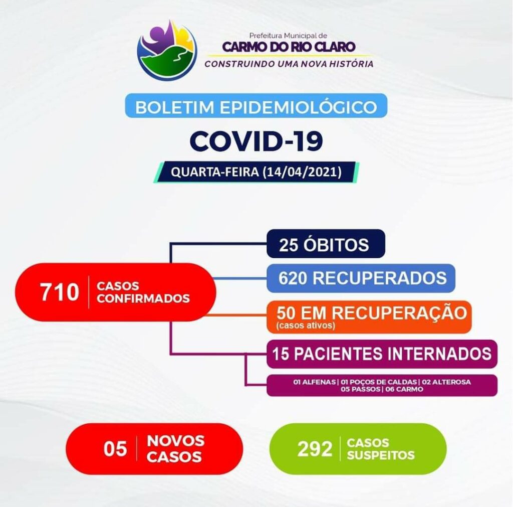 Carmo do Rio Claro registrou nesta quarta-feira (14), de acordo com o boletim epidemiológico divulgado pela prefeitura, 5 novos casos da COVID-19. O município tem 710 casos confirmados com 620 recuperados desde o início da pandemia.