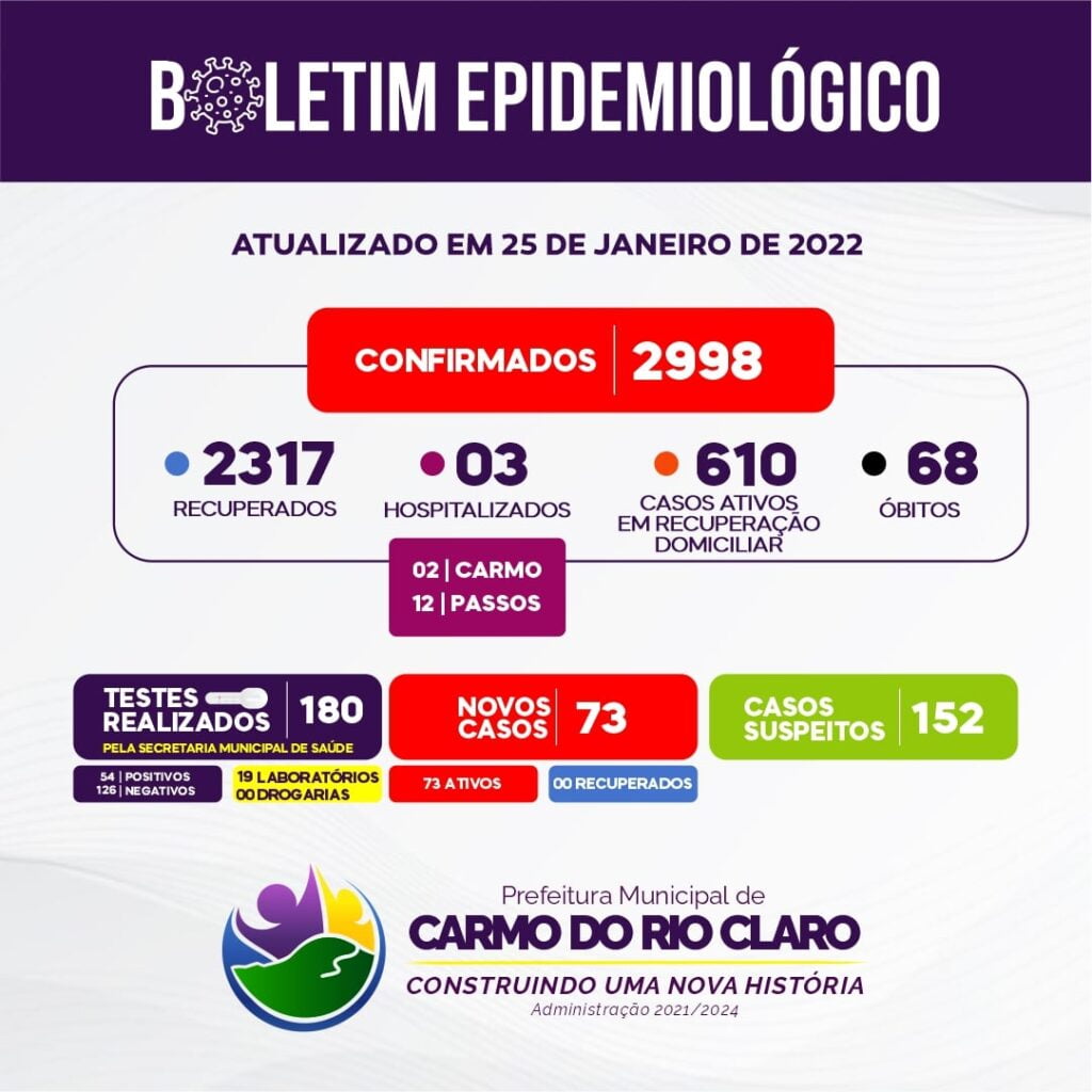 Desde o início da pandemia, Carmo do Rio Claro já registrou 2998 casos confirmados, 2317 recuperados e 68 óbitos causados pelo Coronavírus.