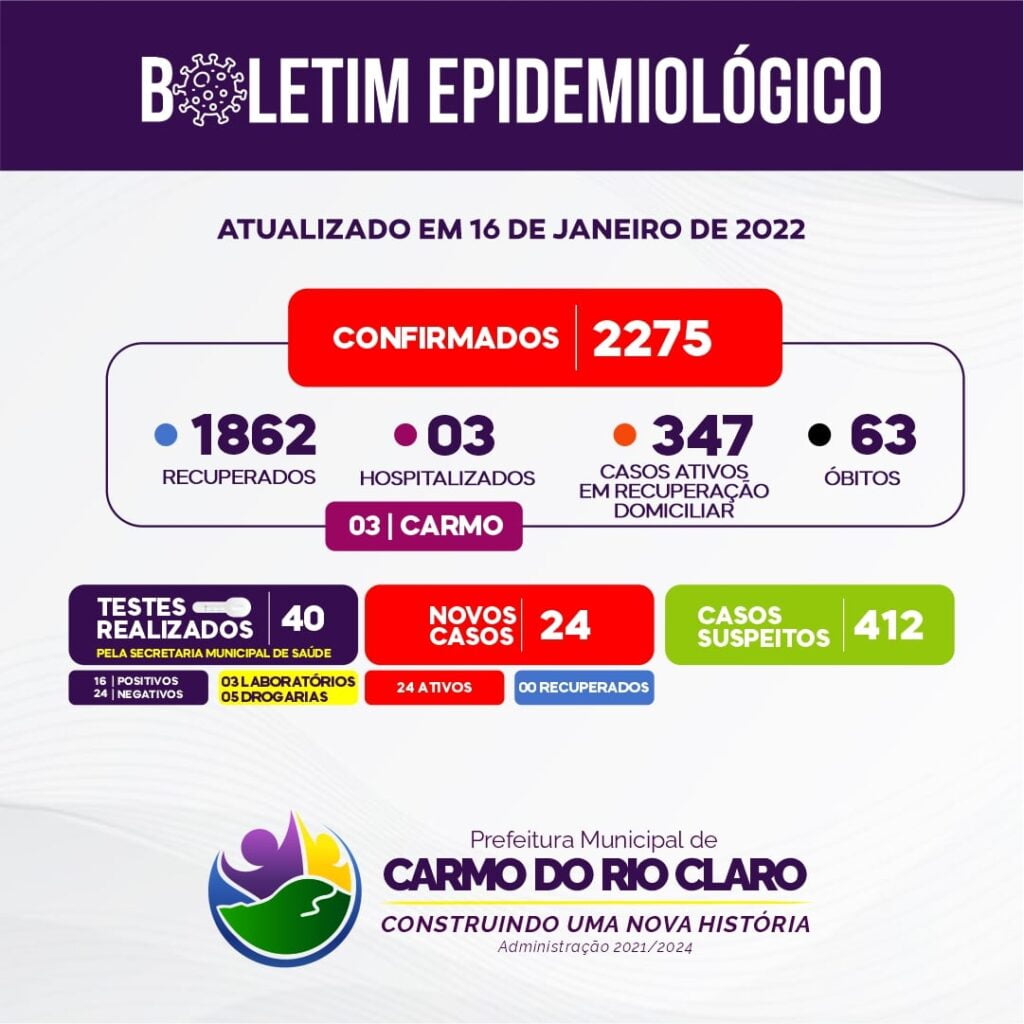 O número de casos suspeitos é de 412 pessoas. Ainda de acordo com o boletim, Carmo do Rio Claro tem 2275 casos confirmados, 1862 recuperados e registrou 63 óbitos desde o início da pandemia.
