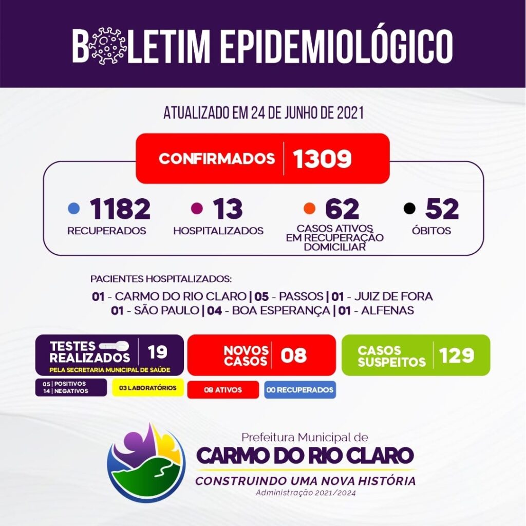 Carmo do Rio Claro registrou nesta quinta-feira (24), mais 08 novos casos positivos da COVID-19. A cidade tem agora 1.309 casos confirmados desde o início da pandemia com 1182 recuperados.