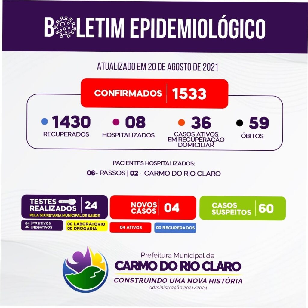 Carmo do Rio Claro registrou nesta sexta-feira (20), mais 04 casos positivos da COVID-19. A cidade tem 1.533 casos confirmados desde o início da pandemia com 1430 recuperados. O número de casos em recuperação domiciliar é de 36 pessoas e 08 estão internados. O número de casos suspeitos é de 60 pessoas. De acordo com o boletim divulgado, os pacientes internados estão na Santa Casa de Passos e no hospital São Vicente de Paulo.