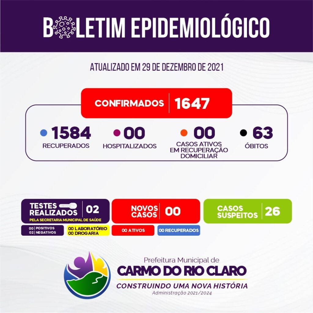 Ainda de acordo com o boletim, Carmo do Rio Claro continua com 1647 casos confirmados, 1584 recuperados e 63 óbitos registrados desde o início da pandemia no ano passado.