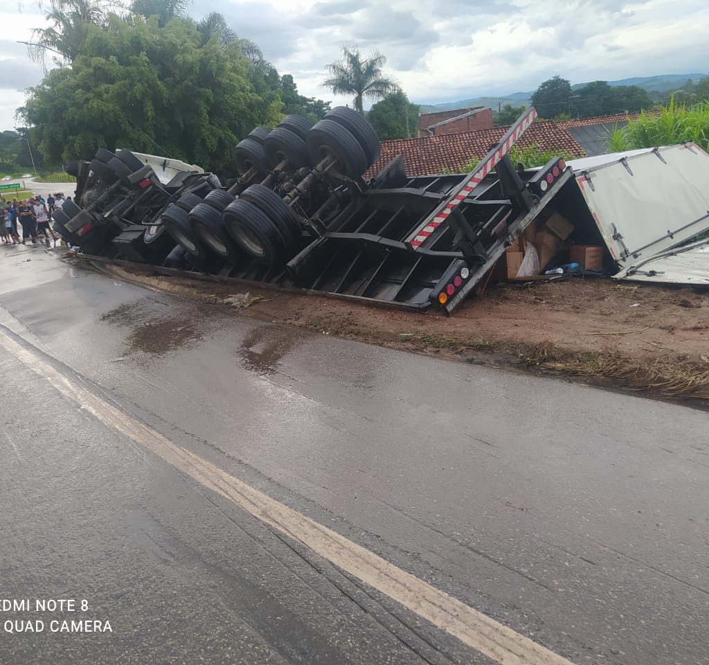 Segundo informações no local, o caminhão juntamente com o semi-reboque transitava pela referida Rodovia, momento em que ao realizar uma curva para a esquerda, nas proximidades de um retorno, perdeu o controle direcional vindo a tombar do lado direito de sua mão de direção.