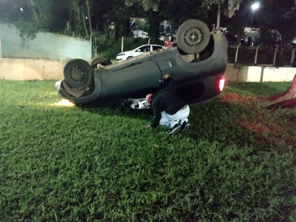 Na madrugada deste domingo (13), um carro capotou na praça São Vicente, em frente ao hospital São Vicente de Paulo, em Carmo do Rio Claro.