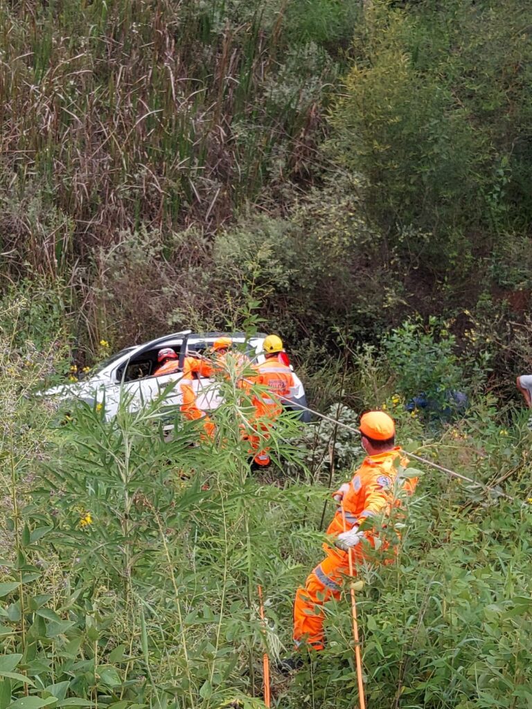 Deslocaram para a ocorrência duas equipes do Corpo de Bombeiros, uma de resgate e outra de Salvamento. Chegando ao local, os militares encontraram o carro em um barranco com forte declive e a cerca de 30 metros da rodovia. Dentro do automóvel estavam duas mulheres, a condutora de 60 anos que estava consciente e queixava de dores no braço direito, abdômen e no pescoço e a passageira, uma mulher de 87 anos que não teve ferimentos aparentes, mas devido ao impacto os militares optaram em atende-la também no local.