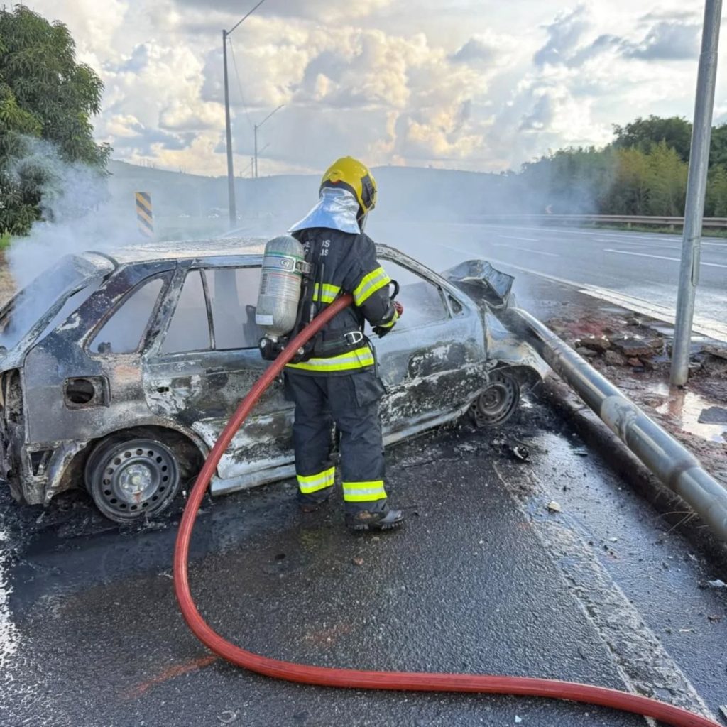 De acordo com o Corpo de Bombeiros, quando a guarnição chegou ao local, o automóvel já estava tomado pelas chamas. O condutor relatou aos militares que o incêndio começou logo após a colisão.