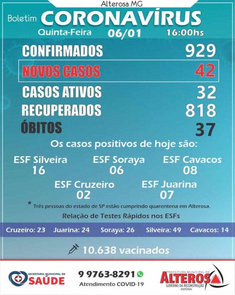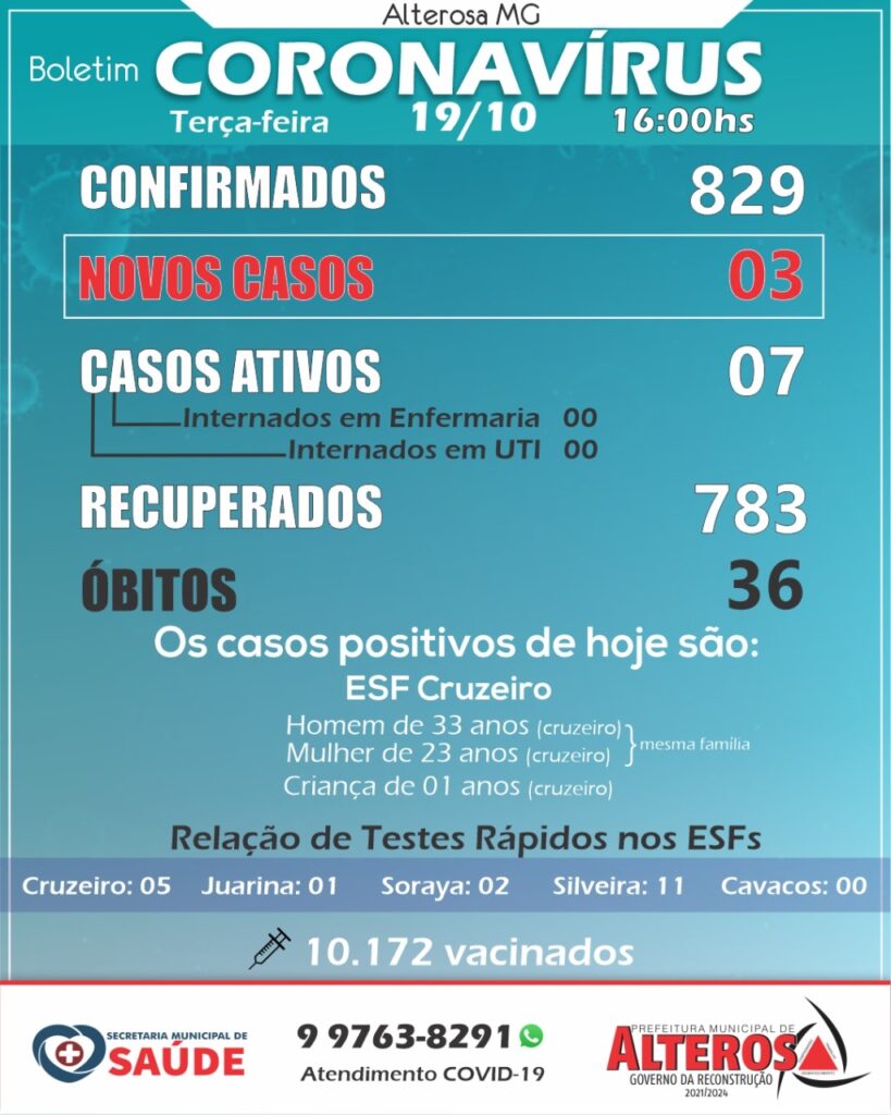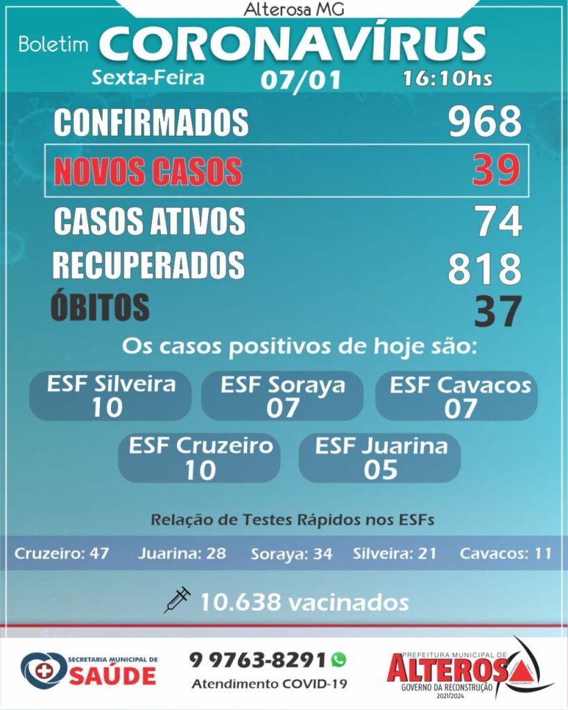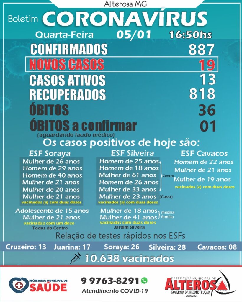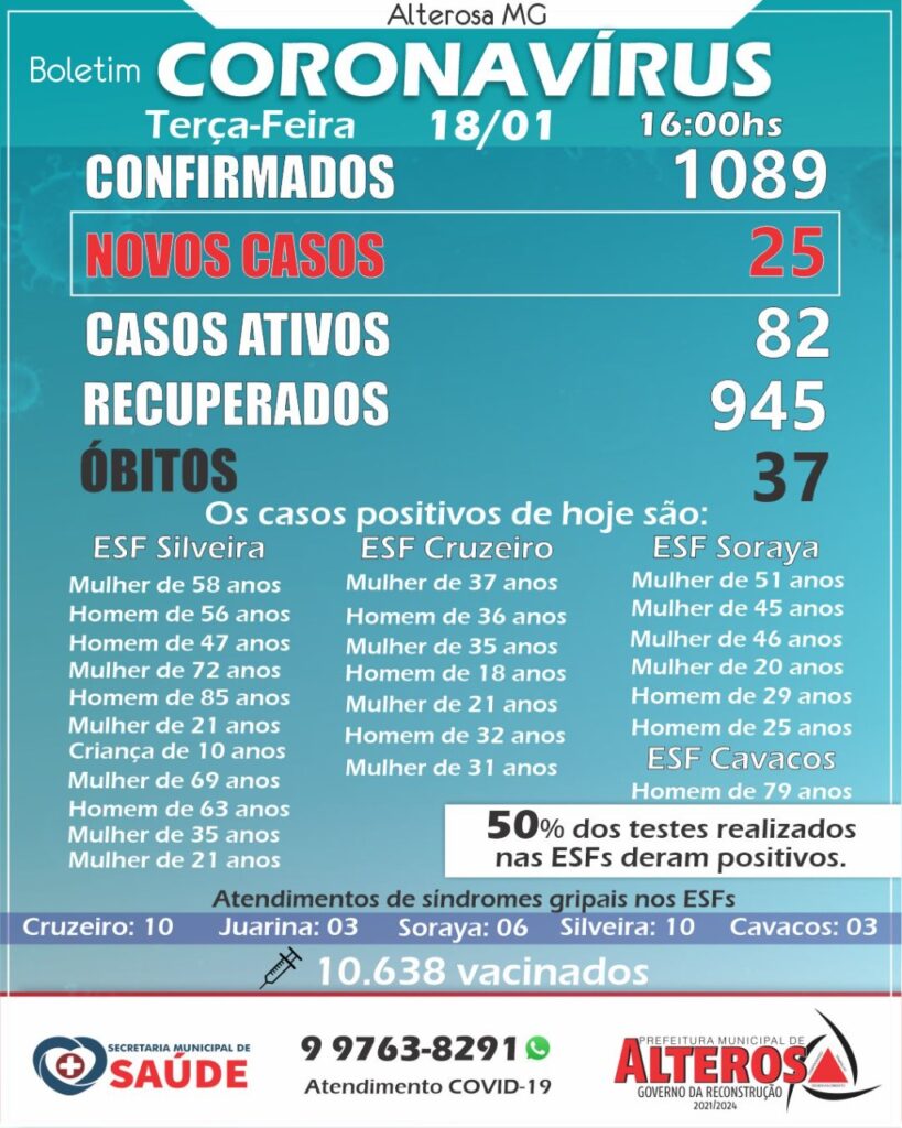 Alterosa registrou nesta terça-feira (18), mais 25 casos positivos da COVID-19. Segundo a Secretaria Municipal de Saúde, a cidade tem 1089 casos confirmados desde o início da pandemia. O número de recuperados é de 945 pessoas. De acordo com o boletim divulgado pela prefeitura, há 82 casos ativos da doença no município. A relação de casos […]