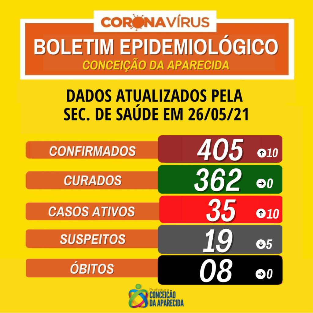 De acordo com o boletim epidemiológico, Conceição da Aparecida tem agora 405 casos confirmados com 362 recuperados desde o início da pandemia. O número de casos ativos na cidade no momento é de 35 pessoas e o de casos suspeitos 19.