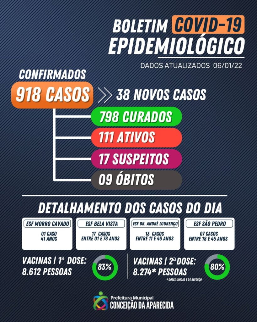 Conceição da Aparecida registrou nesta quinta-feira (06), um total de 38 novos casos positivos da COVID-19. De acordo com o boletim divulgado pela prefeitura, a cidade tem 111 casos ativos da doença.