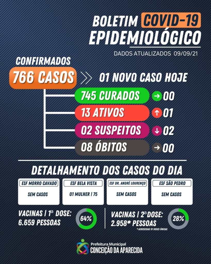 A cidade está com 766 casos confirmados e 745 recuperados desde o início da pandemia. O número de casos ativos, ou seja, com poder de transmissão do vírus é de 13 pessoas e há 02 casos suspeitos no momento. Em Conceição da Aparecida, 08 já morreram vítima do Coronavírus.