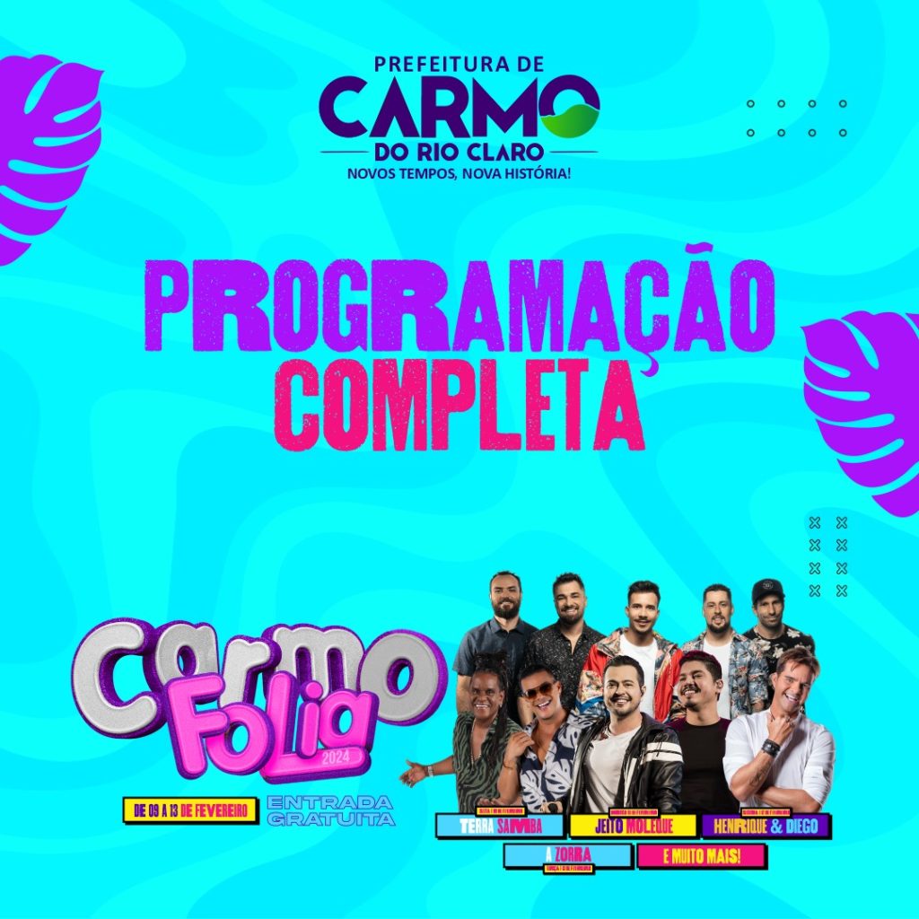 Além dos shows principais com Terra Samba (sexta dia 9), Jeito Moleque (domingo dia 11), Henrique e Diego (segunda dia 12) e A Zorra (terça dia 13), a programação do Carnaval Carmo Folia 2024 tem ainda shows locais, marchinhas com a Turma do Aguenta, a irreverência das Pererecas de Ouro, duas matinês e muito mais…