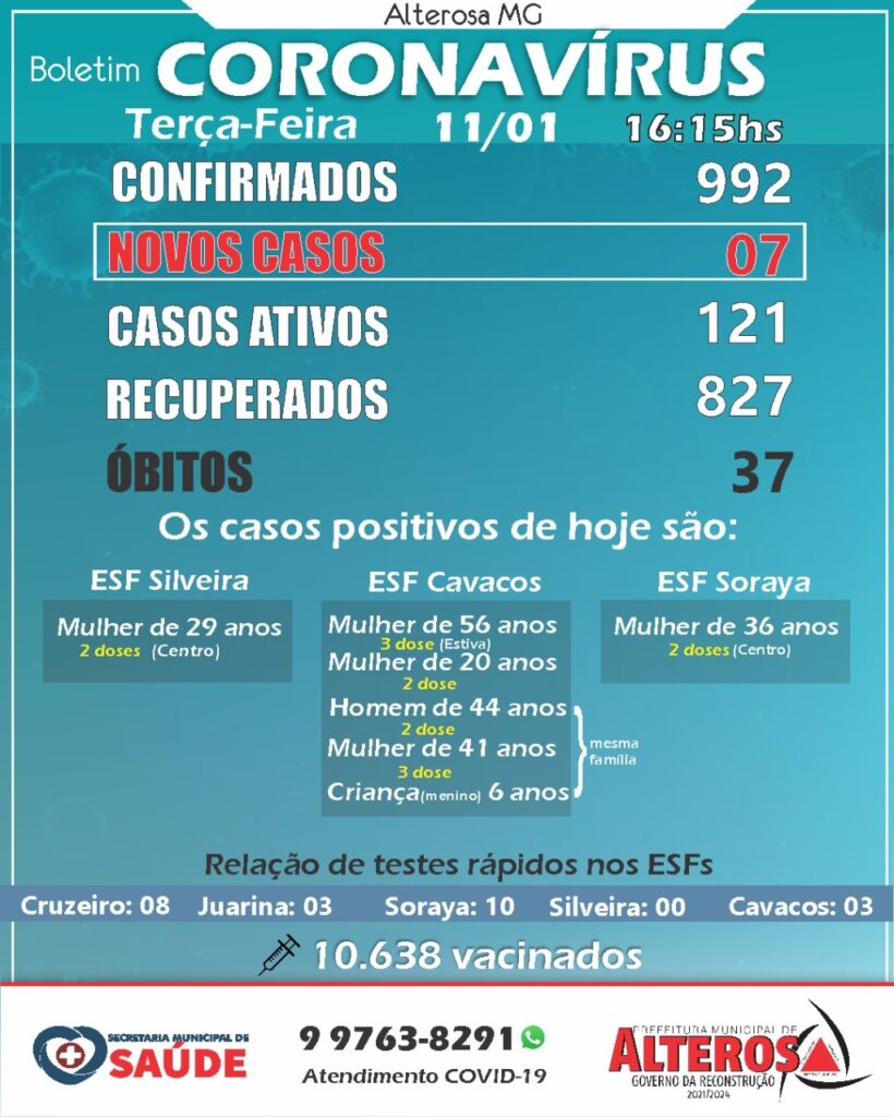 Alterosa registrou nesta terça-feira (11), mais 7 casos positivos da COVID-19. De acordo com o boletim divulgado pela prefeitura, a cidade tem 992 casos confirmados e 827 recuperados desde o início da pandemia.