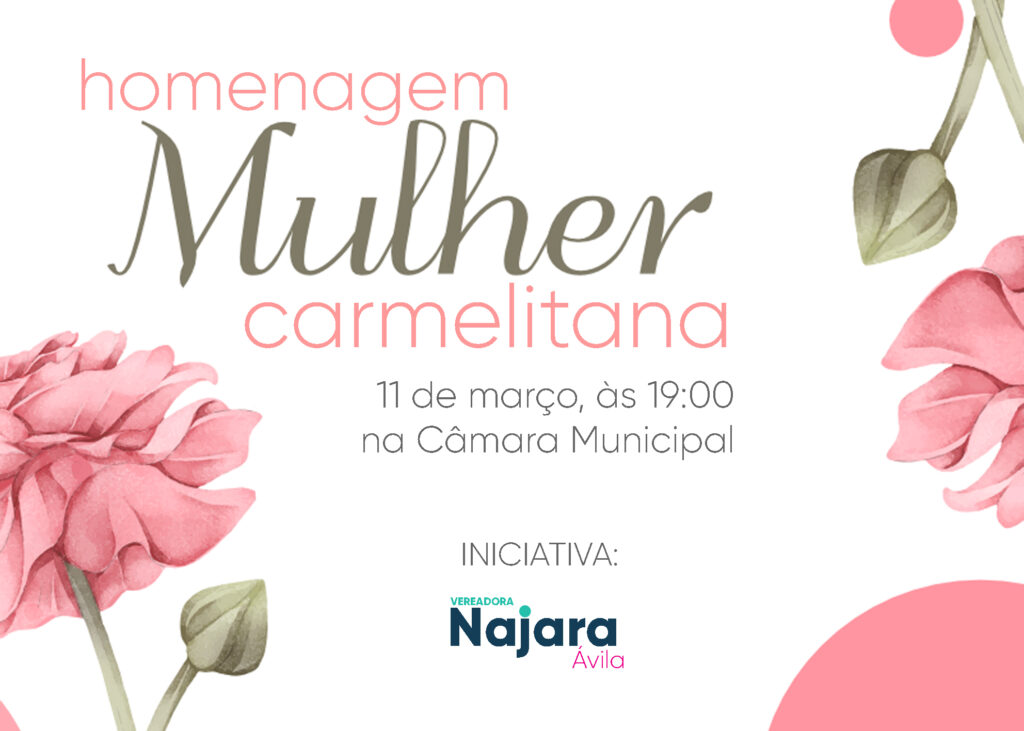 Acontece nesta sexta-feira (11), no plenário da Câmara Municipal, a partir das 19:00, a primeira edição do evento “Mulher Carmelitana”, que irá homenagear 8 mulheres, em razão do Dia Internacional da Mulher, celebrado na última terça-feira, 08 de março.