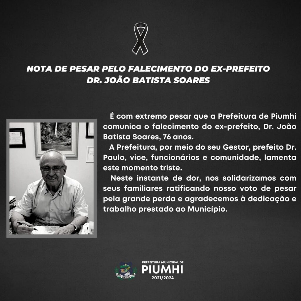 Além de ex prefeito de Piumhi nos anos de 1997 a 2000, Dr. João Batista Soares foi também vice presidente da AMEG (Associação dos Municípios da Microrregião do Médio Rio Grande).