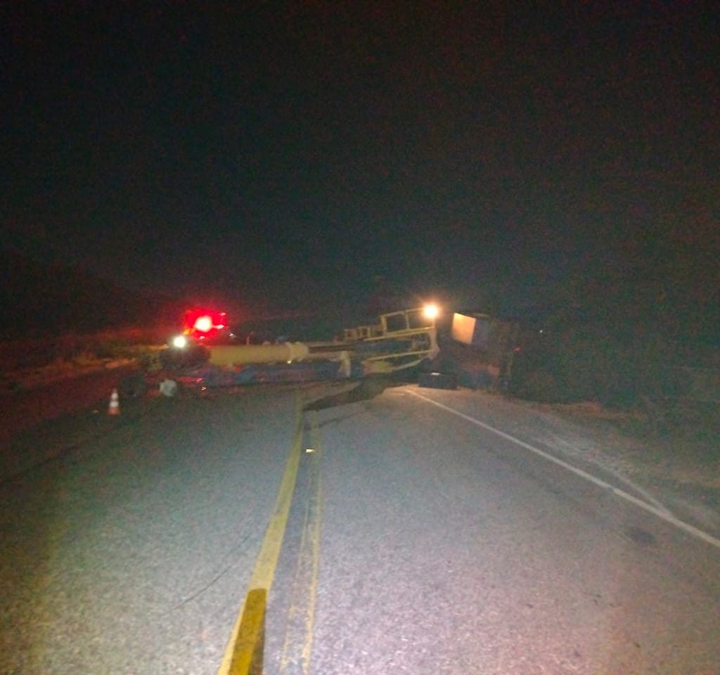 Um guindaste tombou causando a interdição da rodovia no momento em que o equipamento era utilizado para a remoção de uma carreta bi-trem que havia sofrido acidente naquele local. Em determinado momento da operação, o guindaste atingiu uma valeta às margens da rodovia causando o tombamento.
