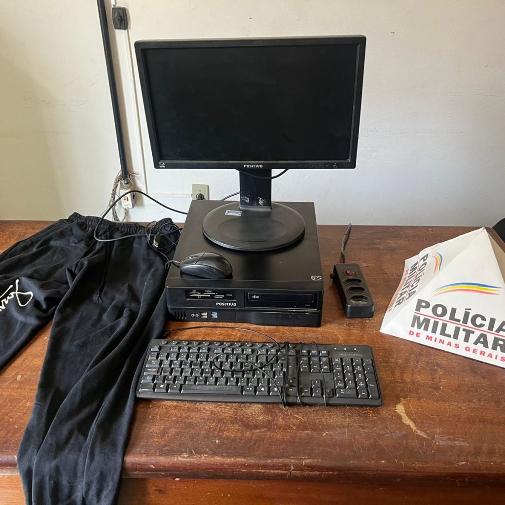 O computador furtado foi encontrado escondido no guarda-roupa de um dos detidos. Um deles foi preso em flagrante e o outro, menor de idade, apreendido.