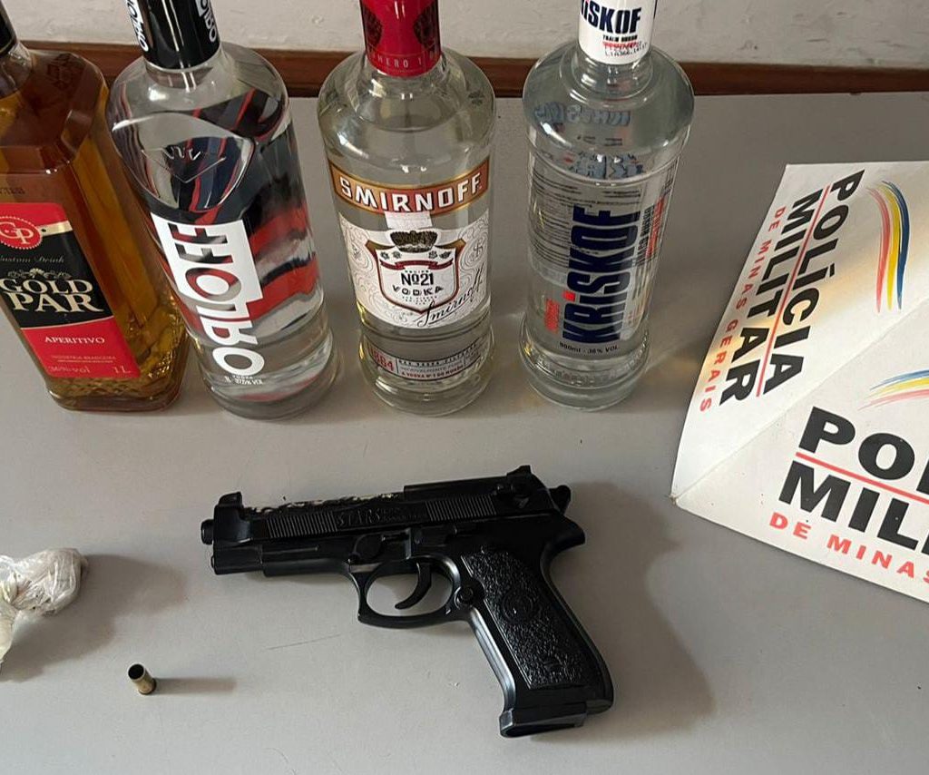 Durante buscas no imóvel, autorizadas pela mãe do suspeito, foram localizadas quatro garrafas de bebidas alcoólicas compatíveis com as descritas pela vítima, além de uma bucha de maconha e uma munição deflagrada calibre .32. Já no terreno da residência, os militares encontraram um simulacro de pistola, semelhante ao objeto que, segundo relatos, o homem utilizava para intimidar moradores e comerciantes da região.