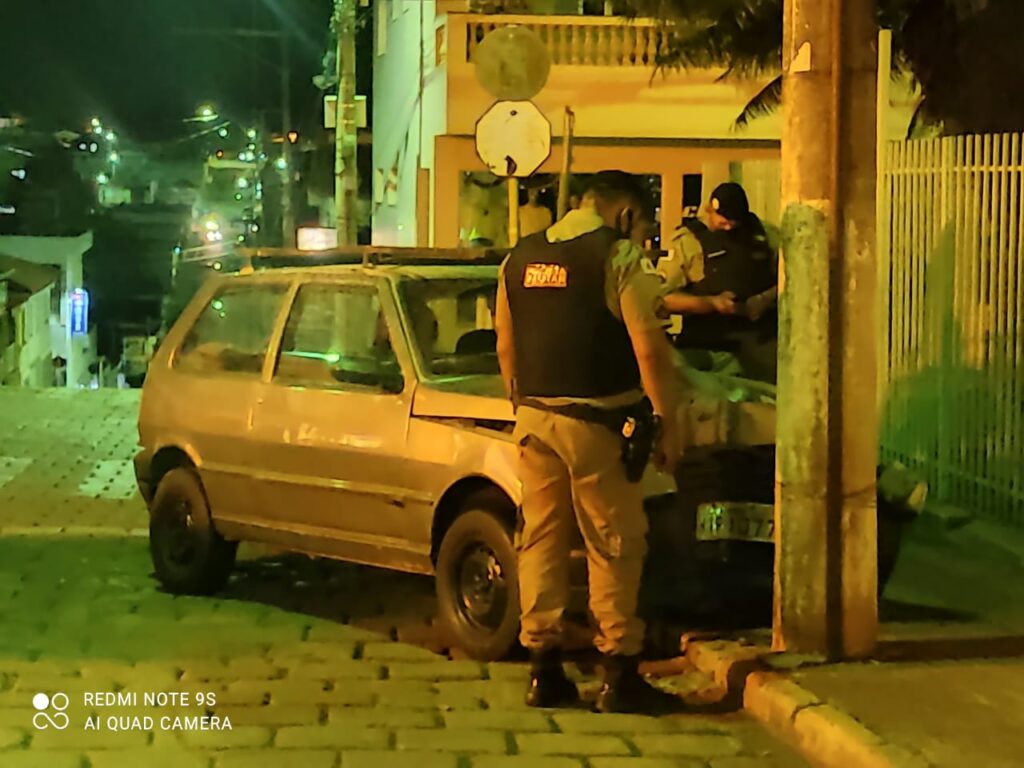 Após furtar um veículo Fiat Uno de cor cinza, o autor bateu o veículo em um poste localizado na Praça Tito Carlos Pereira, no centro da cidade na antiga CEMIG onde funciona atualmente a Secretaria Municipal de Assistência Social.