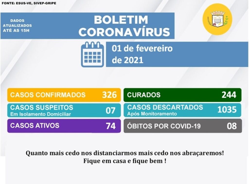 De acordo com o boletim epidemiológico, a cidade tem 74 casos ativos com poder de transmissão do vírus e 7 casos suspeitos. Ao todo 244 casos já foram recuperados.