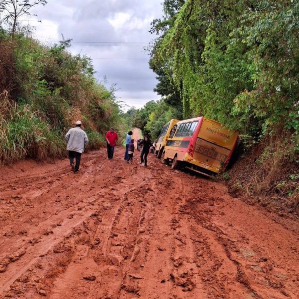 Nas imagens, dois ônibus escolares estavam “encravados” devido a quantidade de lama na estrada.