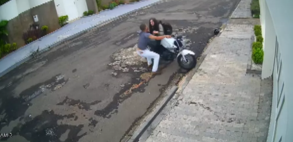 Imagens gravadas pelas câmeras de segurança de uma casa flagraram quando quando o ladrão chega encapuzado e tenta tirar a chave da motocicleta das mãos da mulher. A jovem vai atrás do ladrão e consegue tirar o capuz da cabeça dele.