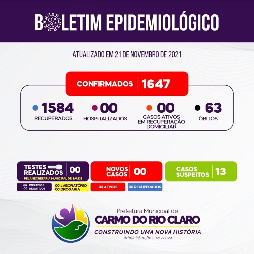 De acordo com o boletim epidemiológico divulgado neste domingo (21), pela prefeitura, Carmo do Rio Claro não possui nenhum caso ativo da COVID-19. Dos 1647 casos registrados desde o início da pandemia, 1584 são considerados recuperados.