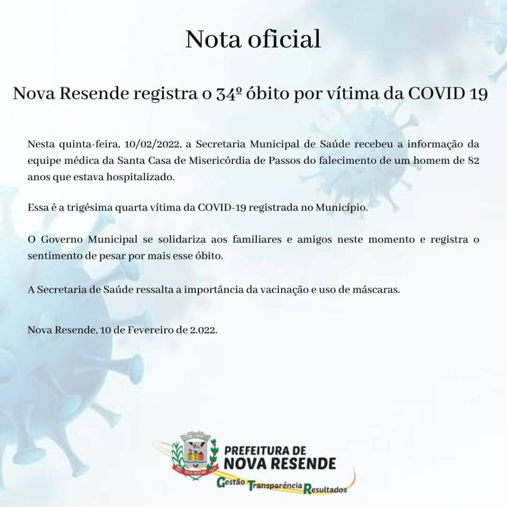 Ontem uma pessoa também morreu vítima da doença na cidade de Nova Resende. Com isso, o município chega a 33 óbitos desde o início da pandemia.
