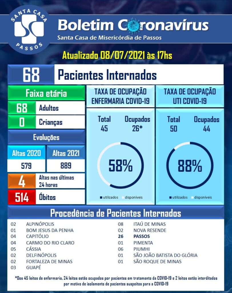 Nas últimas 24 horas, foram registradas 4 altas médicas e 1 óbito. A taxa de ocupação dos leitos está em 58% na enfermaria e 88% na UTI.