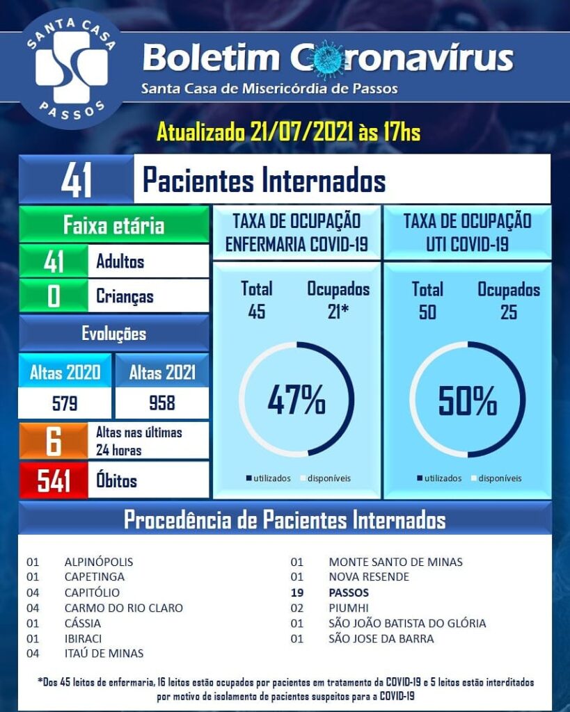 Nas últimas 24 horas, segundo o boletim divulgado pela Santa Casa, foram registrados 06 altas médicas e 01 óbito. Veja a relação de cidades e número de pacientes internados: